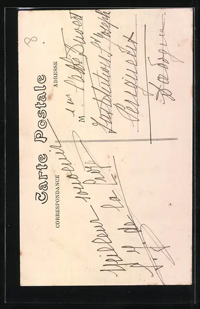 Personenbezogene Daten auf der Rückseite der Karte wurden durch blauen Textmarker unkenntlich gemacht. Die blauen Stellen sind auf die Vorderseite durchgeweicht und wirken sich negativ auf das Postkartenfoto aus