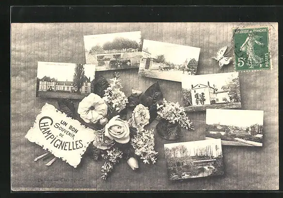 AK Champignelles, Sechs Ansichten aus dem Ort mit Blumen verziert