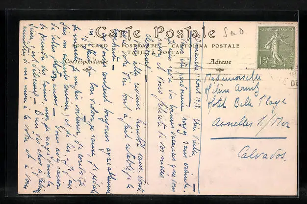 Personenbezogene Daten auf der Rückseite der Karte wurden durch blauen Textmarker unkenntlich gemacht. Die blauen Stellen sind auf die Vorderseite durchgeweicht und wirken sich negativ auf das Postkartenfoto aus