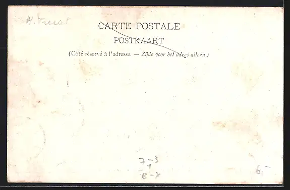 Personenbezogene Daten auf der Rückseite der Karte wurden durch blauen Textmarker unkenntlich gemacht. Die blauen Stellen sind auf die Vorderseite durchgeweicht und wirken sich negativ auf das Postkartenfoto aus
