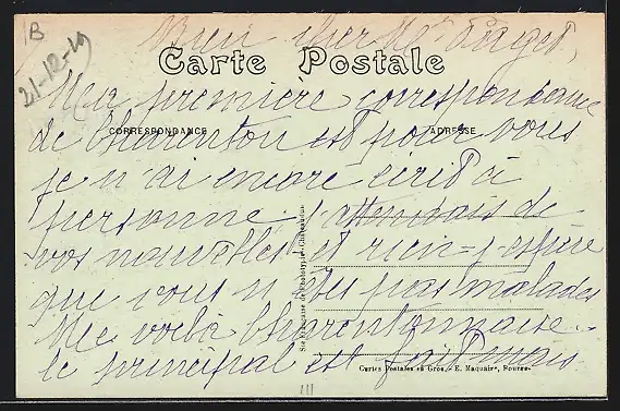 Personenbezogene Daten auf der Rückseite der Karte wurden durch blauen Textmarker unkenntlich gemacht. Die blauen Stellen sind auf die Vorderseite durchgeweicht und wirken sich negativ auf das Postkartenfoto aus