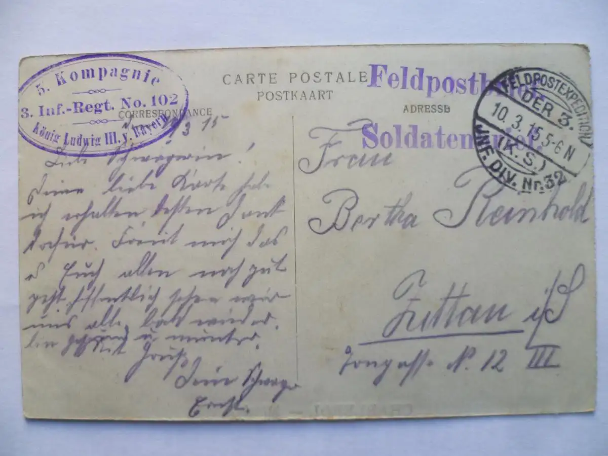 Mit dem Stempel 5. Komp. 3. Inf.-Regt. No. 102 König Ludwig III. v. Bayern (in Zittau stationiert). Stempel 5. Komp. 3. Inf.-Regt. No. 102 König Ludwig III. v. Bayern
