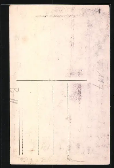 Personenbezogene Daten auf der Rückseite der Karte wurden durch blauen Textmarker unkenntlich gemacht. Die blauen Stellen sind auf die Vorderseite durchgeweicht und wirken sich negativ auf das Postkartenfoto aus