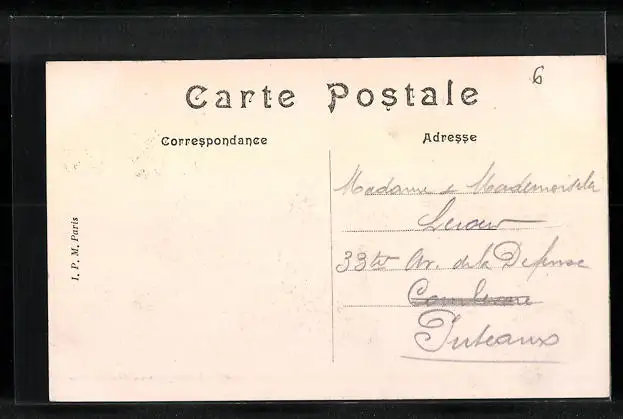 Personenbezogene Daten auf der Rückseite der Karte wurden durch blauen Textmarker unkenntlich gemacht. Die blauen Stellen sind auf die Vorderseite durchgeweicht und wirken sich negativ auf das Postkartenfoto aus