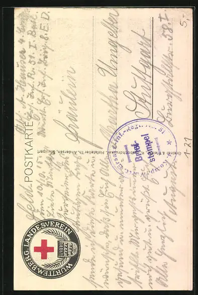 Personenbezogene Daten auf der Rückseite der Karte wurden durch blauen Textmarker unkenntlich gemacht. Die blauen Stellen sind auf die Vorderseite durchgeweicht und wirken sich negativ auf das Postkartenfoto aus