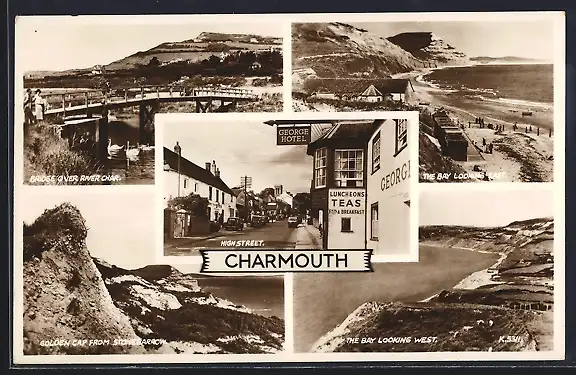 AK Charmouth, High Street with George Hotel, Bridge over River Char, Golden Cap