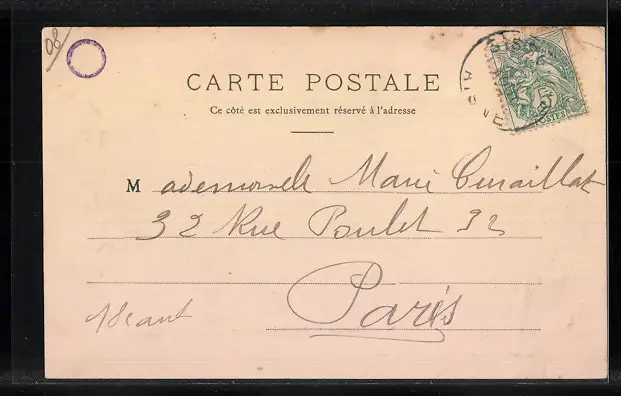 Personenbezogene Daten auf der Rückseite der Karte wurden durch blauen Textmarker unkenntlich gemacht. Die blauen Stellen sind auf die Vorderseite durchgeweicht und wirken sich negativ auf das Postkartenfoto aus