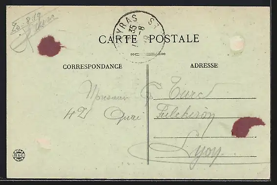 Personenbezogene Daten auf der Rückseite der Karte wurden durch blauen Textmarker unkenntlich gemacht. Die blauen Stellen sind auf die Vorderseite durchgeweicht und wirken sich negativ auf das Postkartenfoto aus