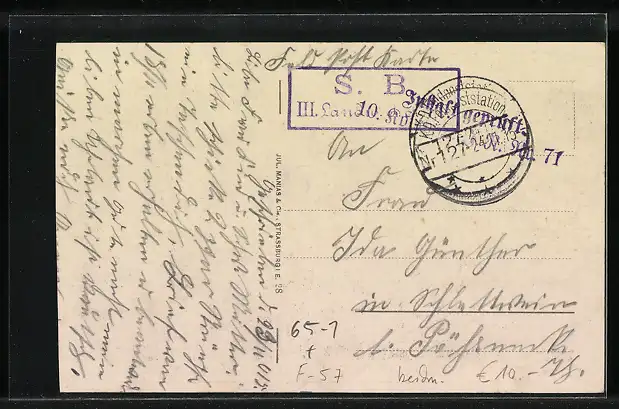 Personenbezogene Daten auf der Rückseite der Karte wurden durch blauen Textmarker unkenntlich gemacht. Die blauen Stellen sind auf die Vorderseite durchgeweicht und wirken sich negativ auf das Postkartenfoto aus
