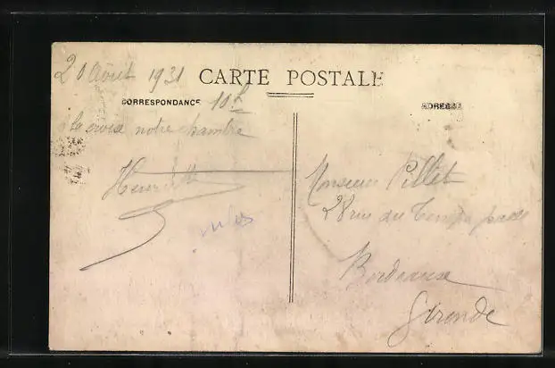 Personenbezogene Daten auf der Rückseite der Karte wurden durch blauen Textmarker unkenntlich gemacht. Die blauen Stellen sind auf die Vorderseite durchgeweicht und wirken sich negativ auf das Postkartenfoto aus
