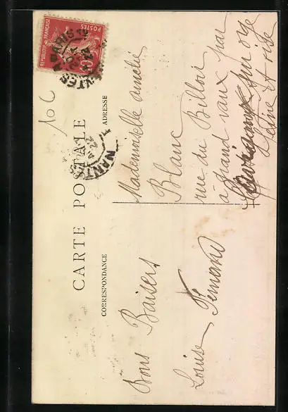 Personenbezogene Daten auf der Rückseite der Karte wurden durch blauen Textmarker unkenntlich gemacht. Die blauen Stellen sind auf die Vorderseite durchgeweicht und wirken sich negativ auf das Postkartenfoto aus