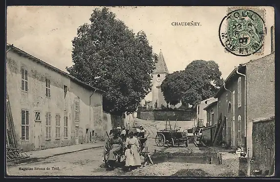 AK Chaudeney, Scène de village avec église et habitants dans la rue