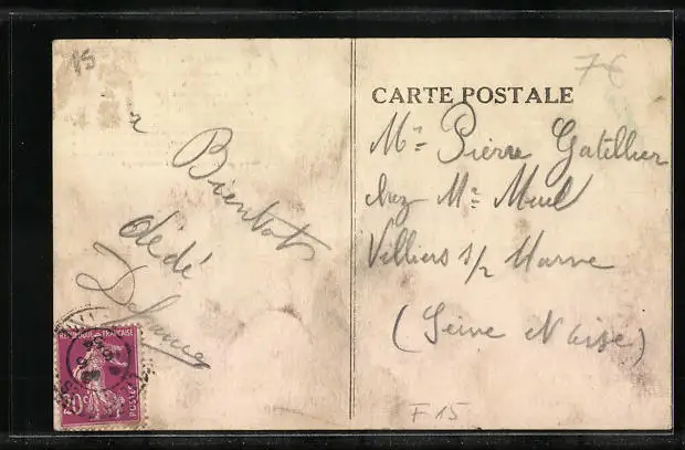 Personenbezogene Daten auf der Rückseite der Karte wurden durch blauen Textmarker unkenntlich gemacht. Die blauen Stellen sind auf die Vorderseite durchgeweicht und wirken sich negativ auf das Postkartenfoto aus