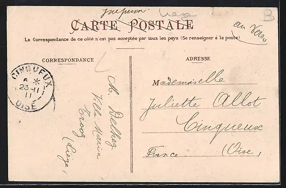 gelaufen 1911, Einriss li. oben, Eckknick re. oben, guter Zustand