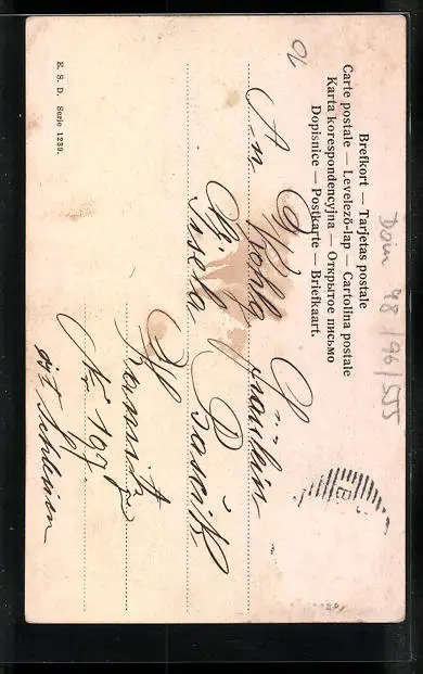 Personenbezogene Daten auf der Rückseite der Karte wurden durch blauen Textmarker unkenntlich gemacht. Die blauen Stellen sind auf die Vorderseite durchgeweicht und wirken sich negativ auf das Postkartenfoto aus