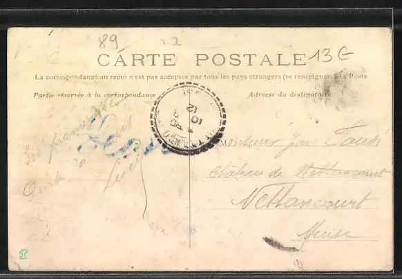 Personenbezogene Daten auf der Rückseite der Karte wurden durch blauen Textmarker unkenntlich gemacht. Die blauen Stellen sind auf die Vorderseite durchgeweicht und wirken sich negativ auf das Postkartenfoto aus
