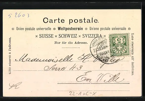 Personenbezogene Daten auf der Rückseite der Karte wurden durch blauen Textmarker unkenntlich gemacht. Die blauen Stellen sind auf die Vorderseite durchgeweicht und wirken sich negativ auf das Postkartenfoto aus