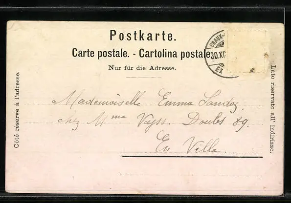 Personenbezogene Daten auf der Rückseite der Karte wurden durch blauen Textmarker unkenntlich gemacht. Die blauen Stellen sind auf die Vorderseite durchgeweicht und wirken sich negativ auf das Postkartenfoto aus