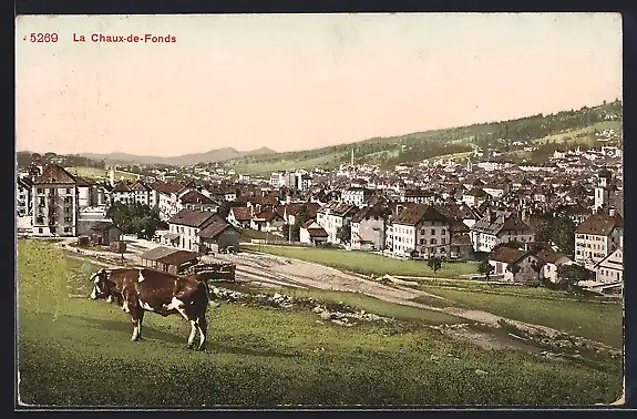 AK Chaux-de-Fonds, Ortsansicht mit Kuh im Vordergrund