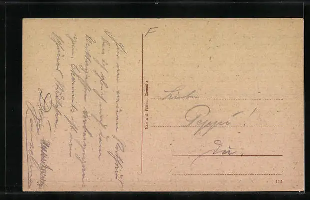 Personenbezogene Daten auf der Rückseite der Karte wurden durch blauen Textmarker unkenntlich gemacht. Die blauen Stellen sind auf die Vorderseite durchgeweicht und wirken sich negativ auf das Postkartenfoto aus
