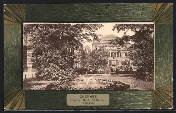 AK Chemnitz, Dresdner Bank mit Becker-Denkmal, Passepartout