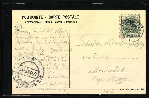 alte Ansichtskarte, gelaufen 1907, Eckknick li. oben, guter Zustand