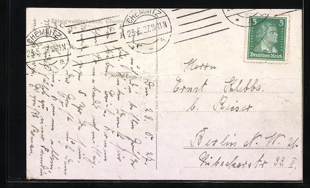 Personenbezogene Daten auf der Rückseite der Karte wurden durch blauen Textmarker unkenntlich gemacht. Die blauen Stellen sind auf die Vorderseite durchgeweicht und wirken sich negativ auf das Postkartenfoto aus