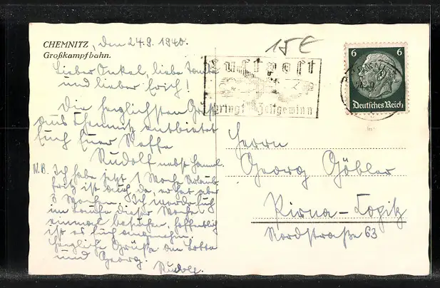 Personenbezogene Daten auf der Rückseite der Karte wurden durch blauen Textmarker unkenntlich gemacht. Die blauen Stellen sind auf die Vorderseite durchgeweicht und wirken sich negativ auf das Postkartenfoto aus