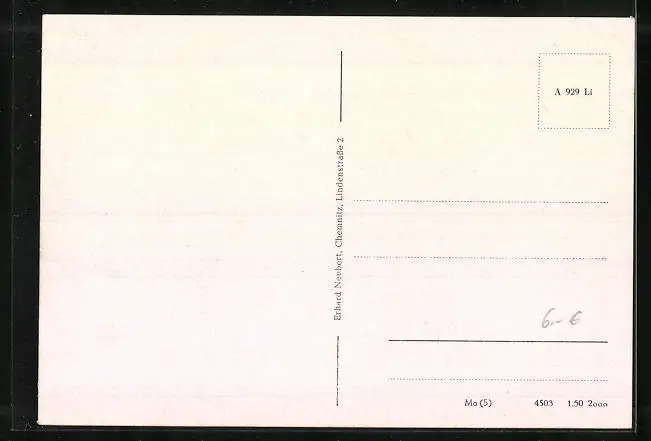 Personenbezogene Daten auf der Rückseite der Karte wurden durch blauen Textmarker unkenntlich gemacht. Die blauen Stellen sind auf die Vorderseite durchgeweicht und wirken sich negativ auf das Postkartenfoto aus
