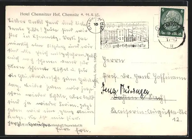 Personenbezogene Daten auf der Rückseite der Karte wurden durch blauen Textmarker unkenntlich gemacht. Die blauen Stellen sind auf die Vorderseite durchgeweicht und wirken sich negativ auf das Postkartenfoto aus