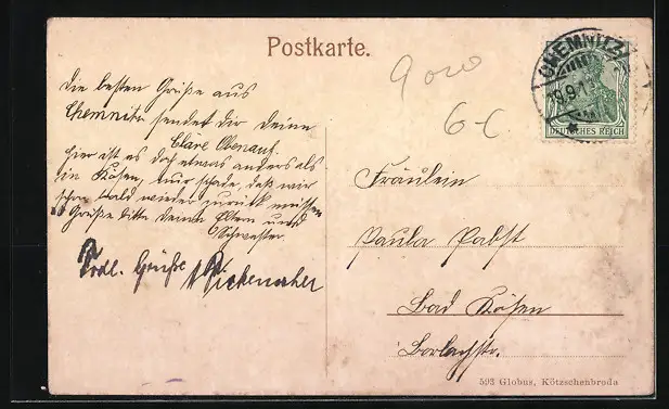 alte Ansichtskarte, gelaufen 1911, Eckknick re. oben, Oberflächenschaden, Stempelspur, guter Zustand