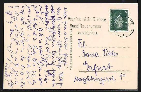 Personenbezogene Daten auf der Rückseite der Karte wurden durch blauen Textmarker unkenntlich gemacht. Die blauen Stellen sind auf die Vorderseite durchgeweicht und wirken sich negativ auf das Postkartenfoto aus