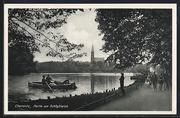 AK Chemnitz, Partie am Schlossteich, mit Kirche, Boot u. Promenade