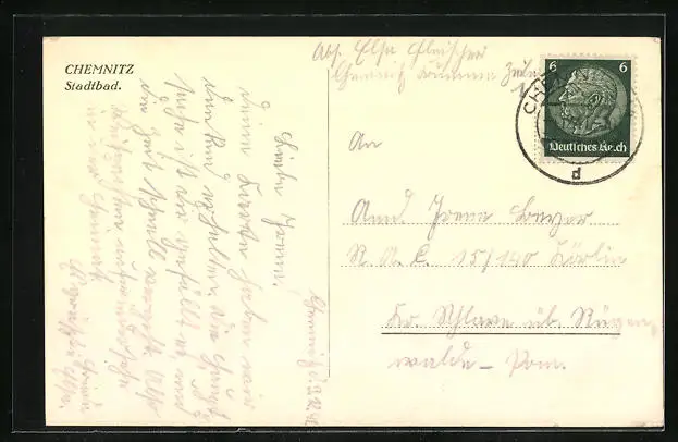 Personenbezogene Daten auf der Rückseite der Karte wurden durch blauen Textmarker unkenntlich gemacht. Die blauen Stellen sind auf die Vorderseite durchgeweicht und wirken sich negativ auf das Postkartenfoto aus