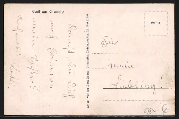 Personenbezogene Daten auf der Rückseite der Karte wurden durch blauen Textmarker unkenntlich gemacht. Die blauen Stellen sind auf die Vorderseite durchgeweicht und wirken sich negativ auf das Postkartenfoto aus