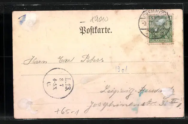 Personenbezogene Daten auf der Rückseite der Karte wurden durch blauen Textmarker unkenntlich gemacht. Die blauen Stellen sind auf die Vorderseite durchgeweicht und wirken sich negativ auf das Postkartenfoto aus