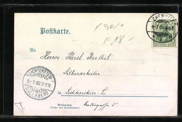 gelaufen 1902, Eckknick links unten, guter Zustand