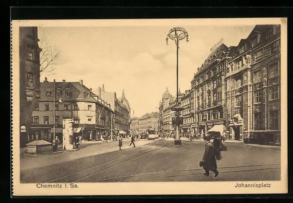 AK Chemnitz i. Sa., Johannisplazt mit Geschäften und Strassenbahn