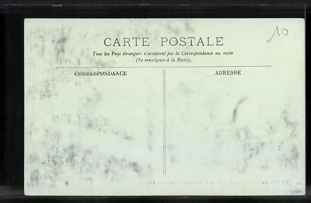 Personenbezogene Daten auf der Rückseite der Karte wurden durch blauen Textmarker unkenntlich gemacht. Die blauen Stellen sind auf die Vorderseite durchgeweicht und wirken sich negativ auf das Postkartenfoto aus