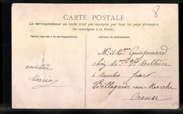Personenbezogene Daten auf der Rückseite der Karte wurden durch blauen Textmarker unkenntlich gemacht. Die blauen Stellen sind auf die Vorderseite durchgeweicht und wirken sich negativ auf das Postkartenfoto aus