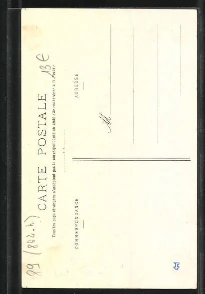 Personenbezogene Daten auf der Rückseite der Karte wurden durch blauen Textmarker unkenntlich gemacht. Die blauen Stellen sind auf die Vorderseite durchgeweicht und wirken sich negativ auf das Postkartenfoto aus