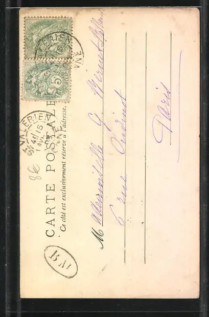 Personenbezogene Daten auf der Rückseite der Karte wurden durch blauen Textmarker unkenntlich gemacht. Die blauen Stellen sind auf die Vorderseite durchgeweicht und wirken sich negativ auf das Postkartenfoto aus