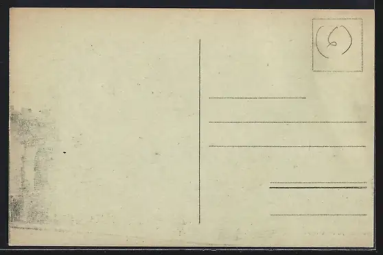 Personenbezogene Daten auf der Rückseite der Karte wurden durch blauen Textmarker unkenntlich gemacht. Die blauen Stellen sind auf die Vorderseite durchgeweicht und wirken sich negativ auf das Postkartenfoto aus