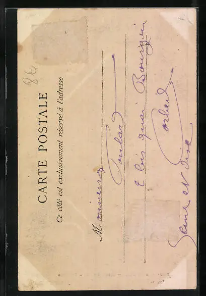 Personenbezogene Daten auf der Rückseite der Karte wurden durch blauen Textmarker unkenntlich gemacht. Die blauen Stellen sind auf die Vorderseite durchgeweicht und wirken sich negativ auf das Postkartenfoto aus