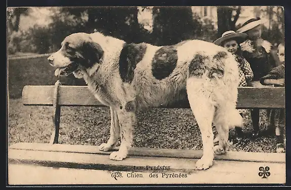 AK Chien des Pyrénées, Pyrenäenberghund steht auf einer Bank