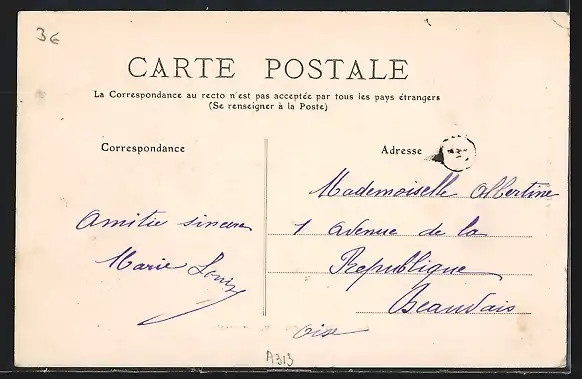 Personenbezogene Daten auf der Rückseite der Karte wurden durch blauen Textmarker unkenntlich gemacht. Die blauen Stellen sind auf die Vorderseite durchgeweicht und wirken sich negativ auf das Postkartenfoto aus