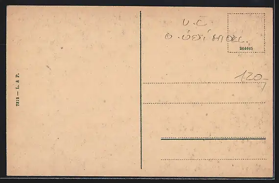 Personenbezogene Daten auf der Rückseite der Karte wurden durch blauen Textmarker unkenntlich gemacht. Die blauen Stellen sind auf die Vorderseite durchgeweicht und wirken sich negativ auf das Postkartenfoto aus