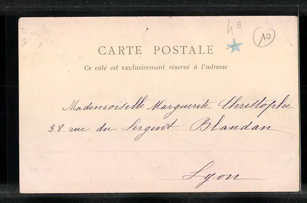 Personenbezogene Daten auf der Rückseite der Karte wurden durch blauen Textmarker unkenntlich gemacht. Die blauen Stellen sind auf die Vorderseite durchgeweicht und wirken sich negativ auf das Postkartenfoto aus