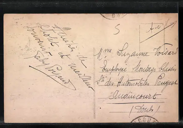 Personenbezogene Daten auf der Rückseite der Karte wurden durch blauen Textmarker unkenntlich gemacht. Die blauen Stellen sind auf die Vorderseite durchgeweicht und wirken sich negativ auf das Postkartenfoto aus
