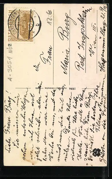 Personenbezogene Daten auf der Rückseite der Karte wurden durch blauen Textmarker unkenntlich gemacht. Die blauen Stellen sind auf die Vorderseite durchgeweicht und wirken sich negativ auf das Postkartenfoto aus